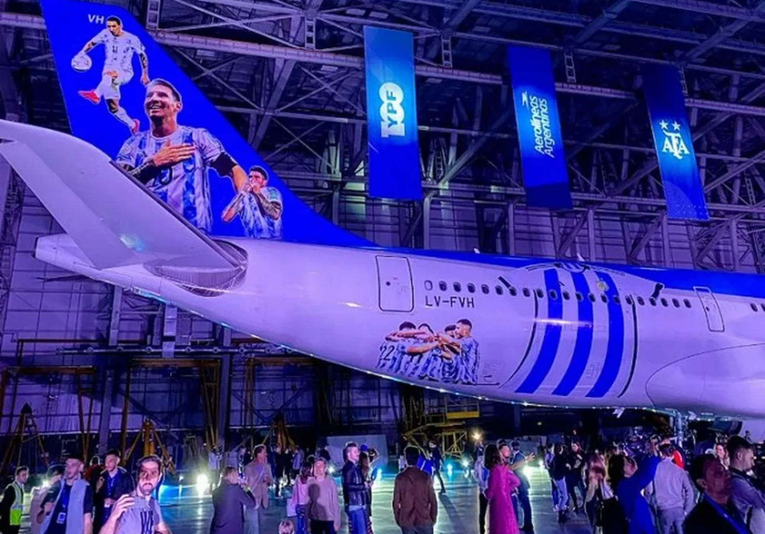 Argentina apresenta avião temático para Copa do Mundo com fotos de Messi, Di María e De Paul