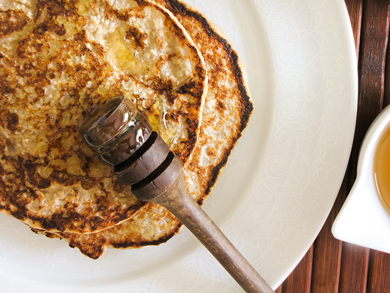 Bata a banana, água e a linhaça no liquidificador. Num outro recipiente misture a aveia com o fermento. Acrescente a mistura de banana a aveia e misture bem com uma espátula. Aqueça uma frigideira e coloque um fio de óleo de coco, muito pouco. Coloque 1 concha da massa da panqueca, tampe e espere 2 minutos para virar. Os tempos de cozimento podem variar. Sirva com o que você mais gostar. Eu usei requeijão cremoso com um fio de mel.
