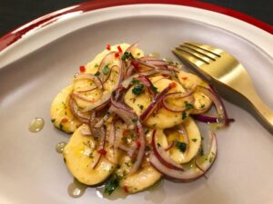 Retornar a Página Principal Ceviche de banana-da-terra Ingredientes 1/2 cebola roxa 2 bananas-da-terra 15 pimentas biquinho em conserva 1 limão Salsinha a gosto Sal a