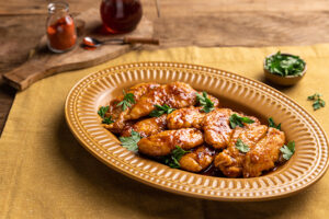 O corte usado nesta receita é o sassami, a parte interna do peito, muito macia e suculenta. A superfície brilhante e adocicada é por causa do molho agridoce, preparado com mel, páprica e vinagre. Sirva acompanhado de escarola refogada com amendoim picante.